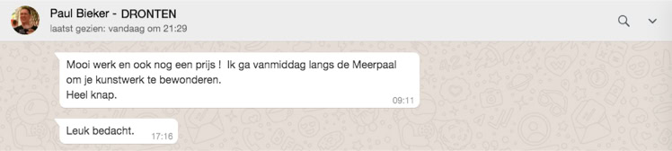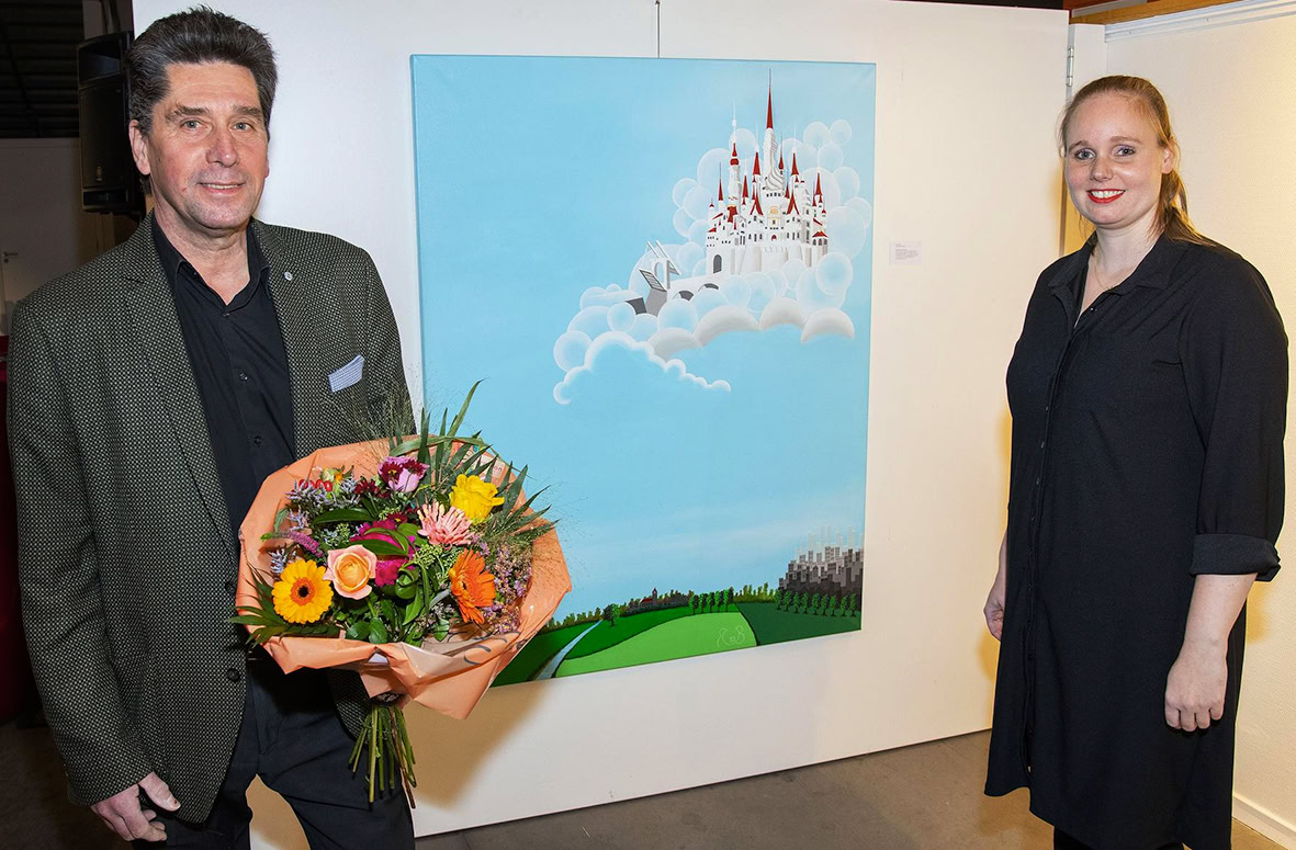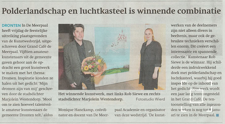 Flevopost 10 dec. 2021 - Kunstenaar Rob Siewe is uitgeroepen tot de winnaar van de Kunstwedstrijd, die werd uitgeschreven door Grand Café De Meerpaal in Dronten. Hij schilderde een indrukwekkend doek met polderlandschap en luchtkasteel, waarbij hij goed inspeelde op de inhoud van het gedicht. De feestelijke prijsuitreiking vond vrijdag 10 december 2021 plaats in theater De Meerpaal. Tekst Monique Hanekamp